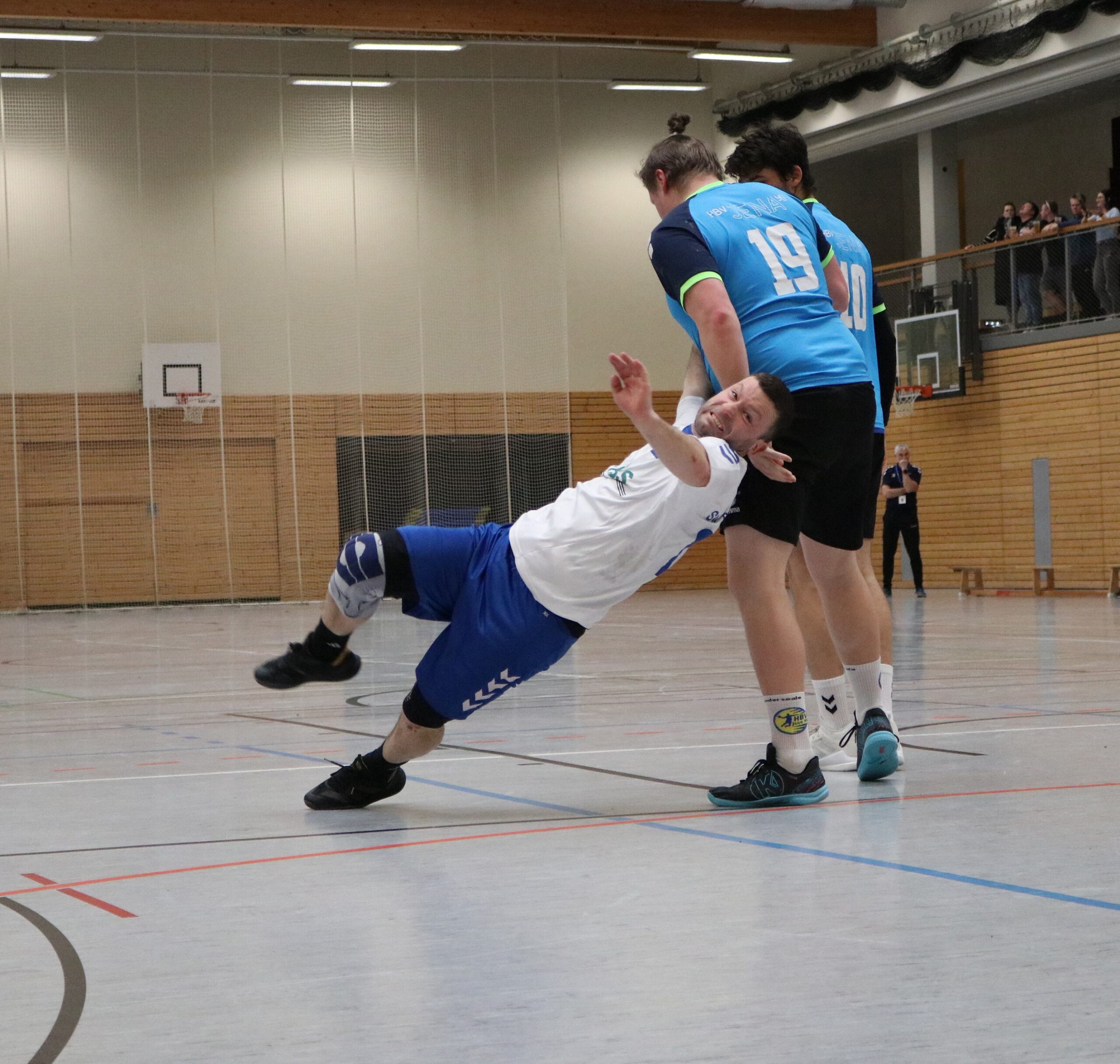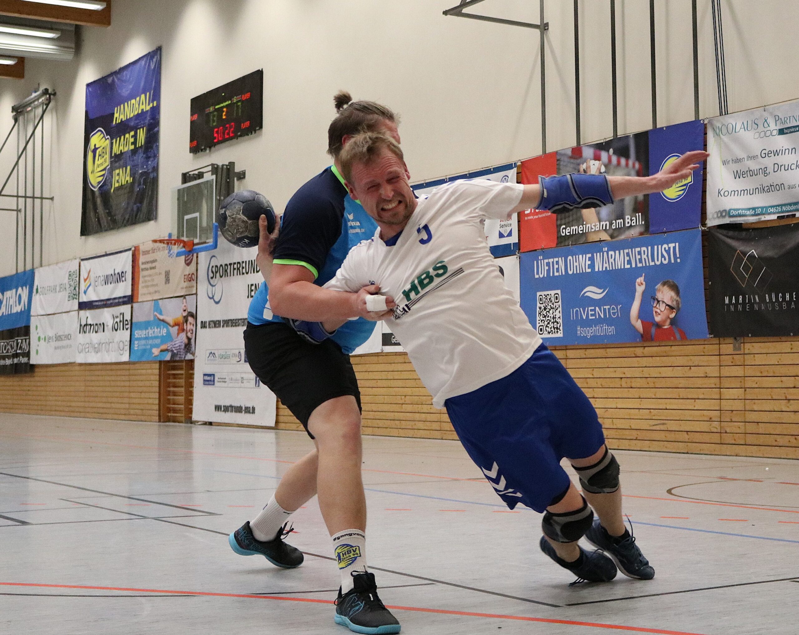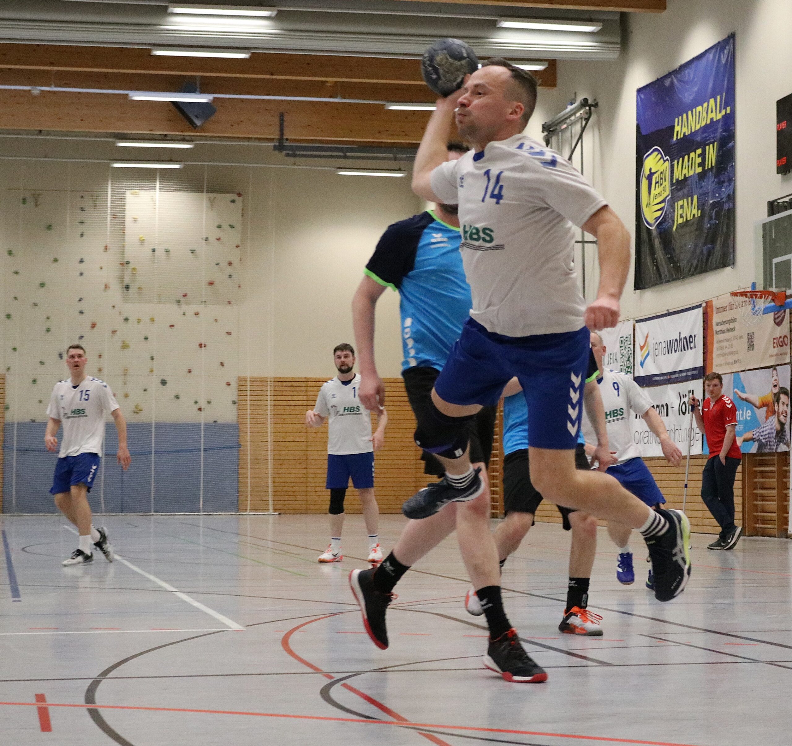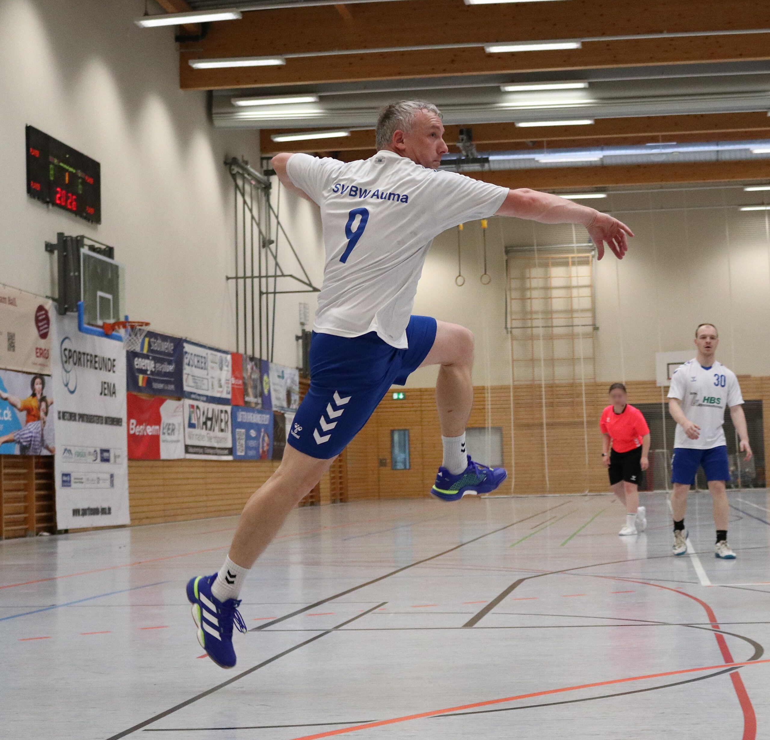 Am Wochenende mussten die Blau-Weiß-Männer beim HBV 90 Jena auf die Handballplatte und wurden wieder von zahlreichen Fans begleitet, die von Beginn an von den Rängen ein Feuerwerk abbrannten. Das gelang zu Beginn den Aumaer Aktiven allerdings nicht. Nach einem 2:0-Rückstand betrieb man viel Aufwand, um die gegnerische Deckung zu überwinden. Das gelang erstmals nach mehr als sechs Minuten mit dem 2:1-Anschlusstreffer. Danach entwickelte sich eine ausgeglichene Partie, in der Andreas Röhler zum 4:4-Ausgleich einnetzte. Trotz zweier Paraden von Leon Geiler gelang es in der Folgezeit nicht, in Führung zu gehen. Im Gegenteil: Die Jenaer legten wieder zwei Treffer vor. Zwar glich Manuel Gaipl nach knapp zwanzig Minuten beim 6:6 erneut aus, doch beim 10:6 lagen die Gastgeber sogar mit vier Treffern vorn und drohten, sich weiter abzusetzen. Doch die Blau-Weißen konnten noch zulegen. Torhüter Leon Geiler holte unter den Augen seines verletzten Kollegen Philipp Kopp wichtige Bälle, und seine Vorderleute stellten nun die kleinen Fehler ab. Kurz vor der Pause trafen die Gäste zum 11:11-Halbzeitstand.
