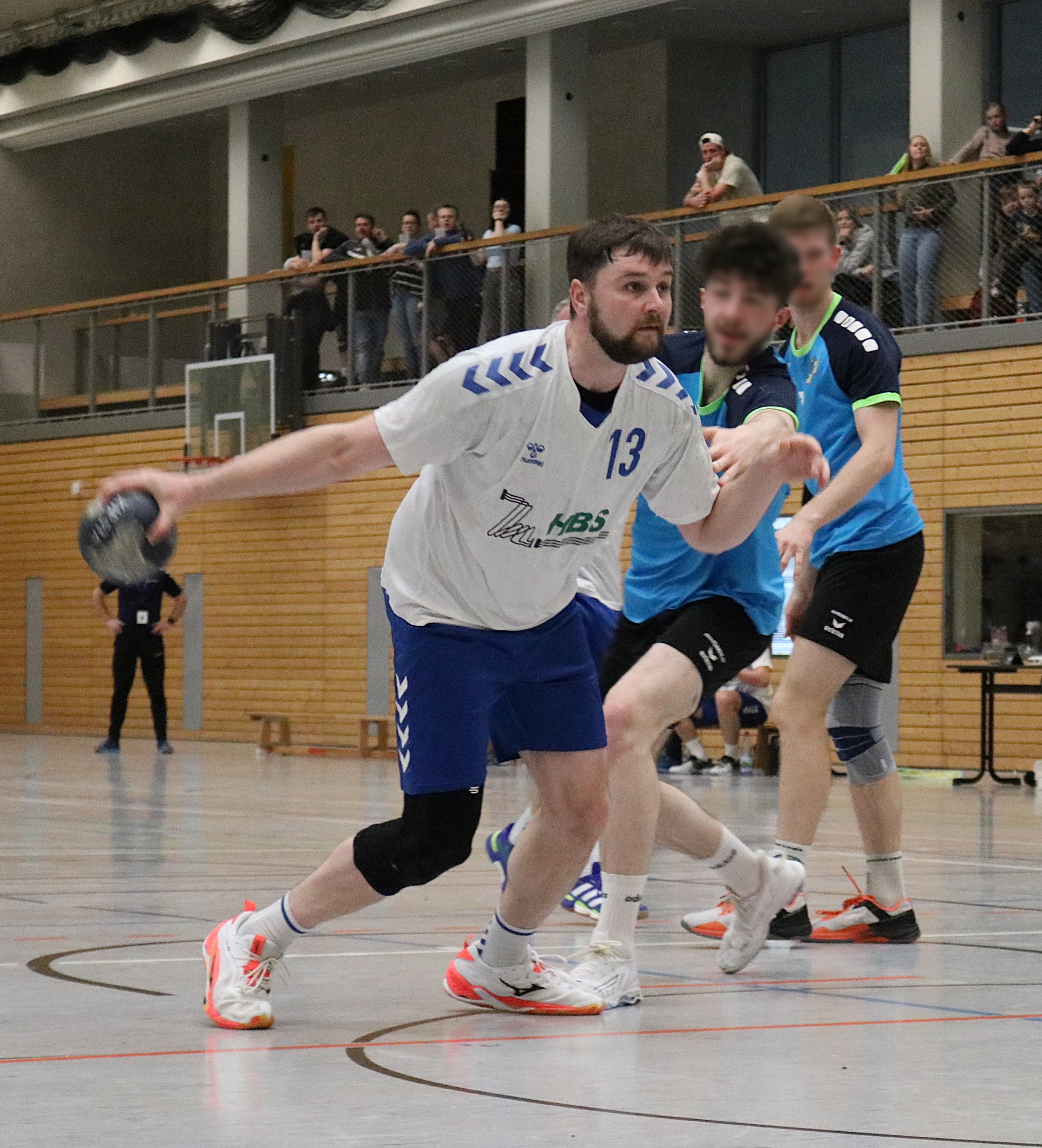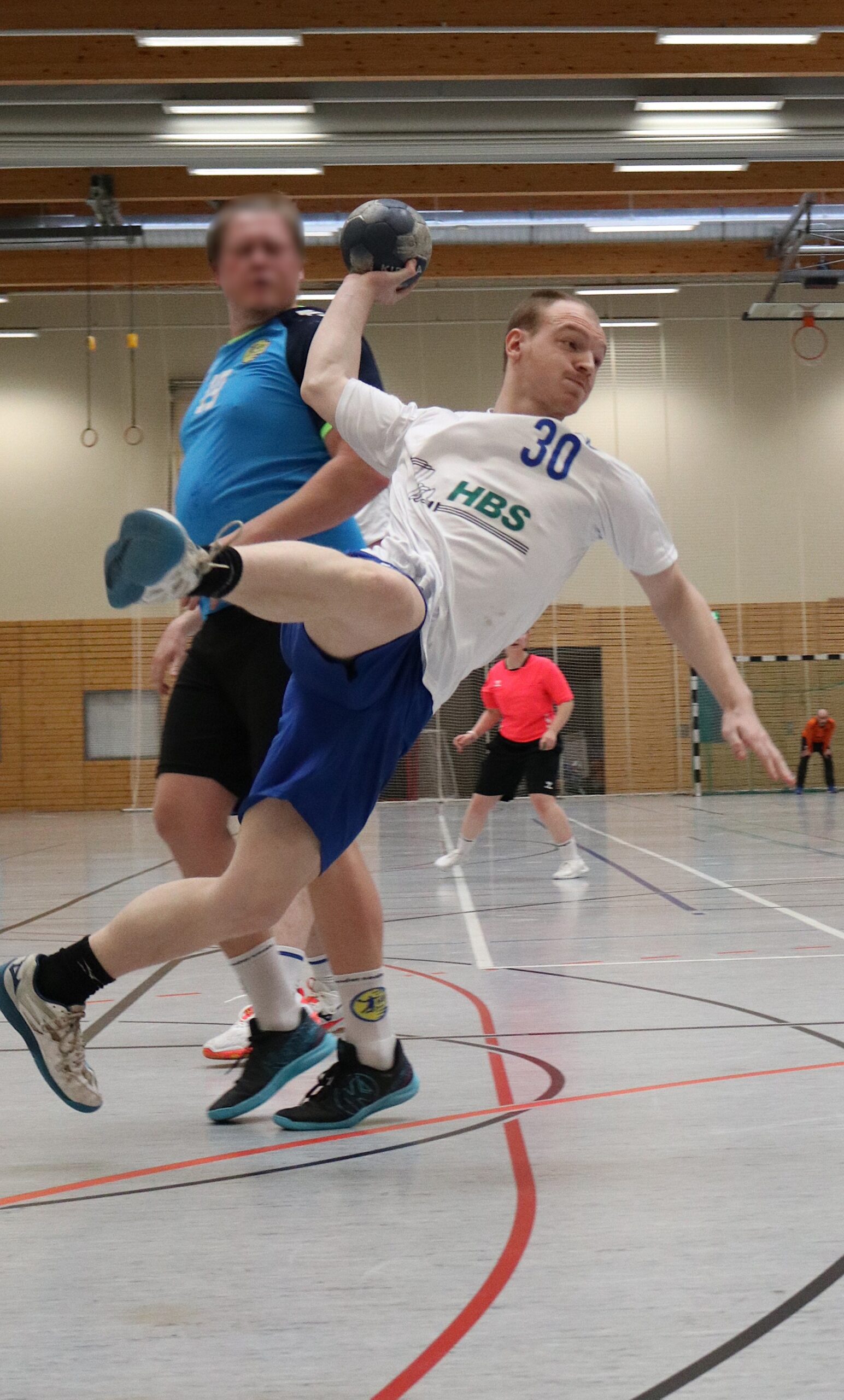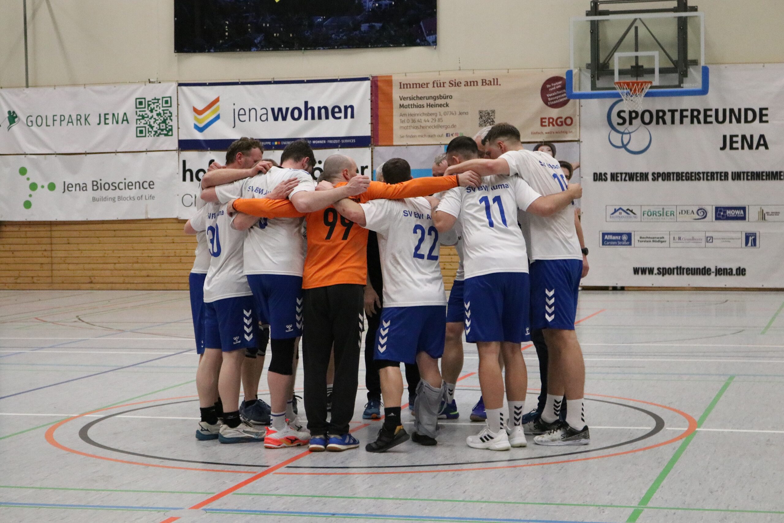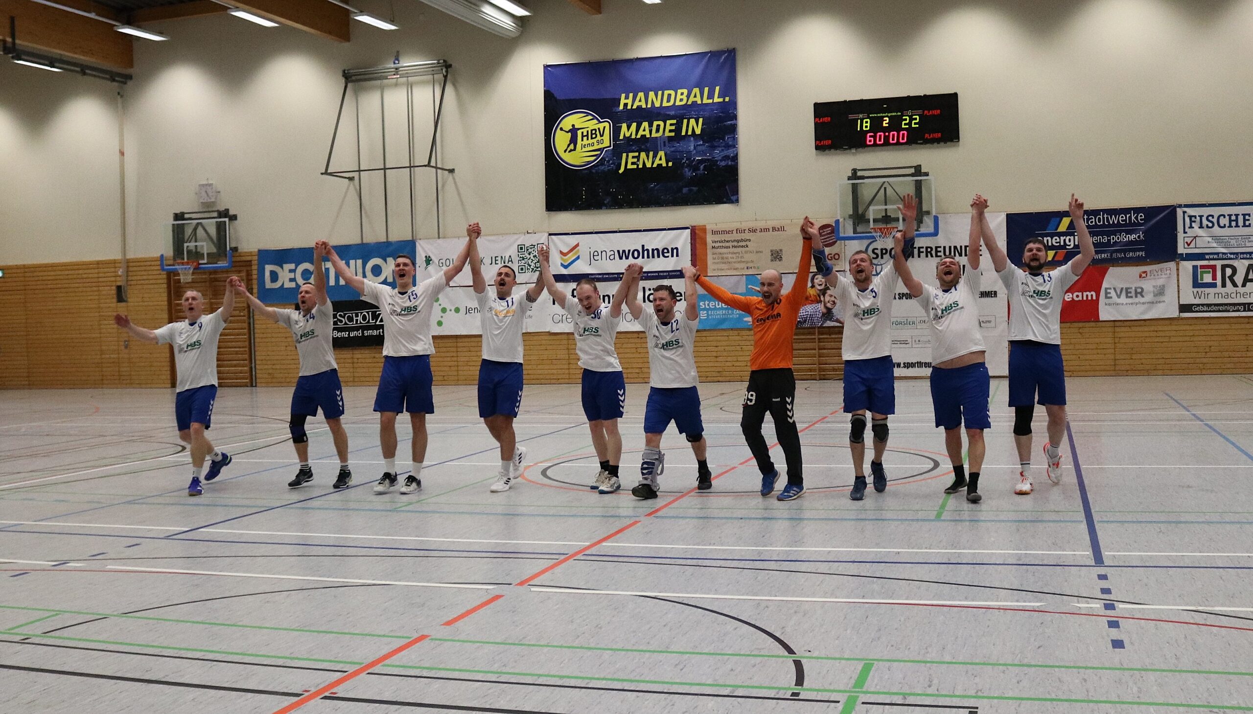 Am Wochenende mussten die Blau-Weiß-Männer beim HBV 90 Jena auf die Handballplatte und wurden wieder von zahlreichen Fans begleitet, die von Beginn an von den Rängen ein Feuerwerk abbrannten. Das gelang zu Beginn den Aumaer Aktiven allerdings nicht. Nach einem 2:0-Rückstand betrieb man viel Aufwand, um die gegnerische Deckung zu überwinden. Das gelang erstmals nach mehr als sechs Minuten mit dem 2:1-Anschlusstreffer. Danach entwickelte sich eine ausgeglichene Partie, in der Andreas Röhler zum 4:4-Ausgleich einnetzte. Trotz zweier Paraden von Leon Geiler gelang es in der Folgezeit nicht, in Führung zu gehen. Im Gegenteil: Die Jenaer legten wieder zwei Treffer vor. Zwar glich Manuel Gaipl nach knapp zwanzig Minuten beim 6:6 erneut aus, doch beim 10:6 lagen die Gastgeber sogar mit vier Treffern vorn und drohten, sich weiter abzusetzen. Doch die Blau-Weißen konnten noch zulegen. Torhüter Leon Geiler holte unter den Augen seines verletzten Kollegen Philipp Kopp wichtige Bälle, und seine Vorderleute stellten nun die kleinen Fehler ab. Kurz vor der Pause trafen die Gäste zum 11:11-Halbzeitstand.