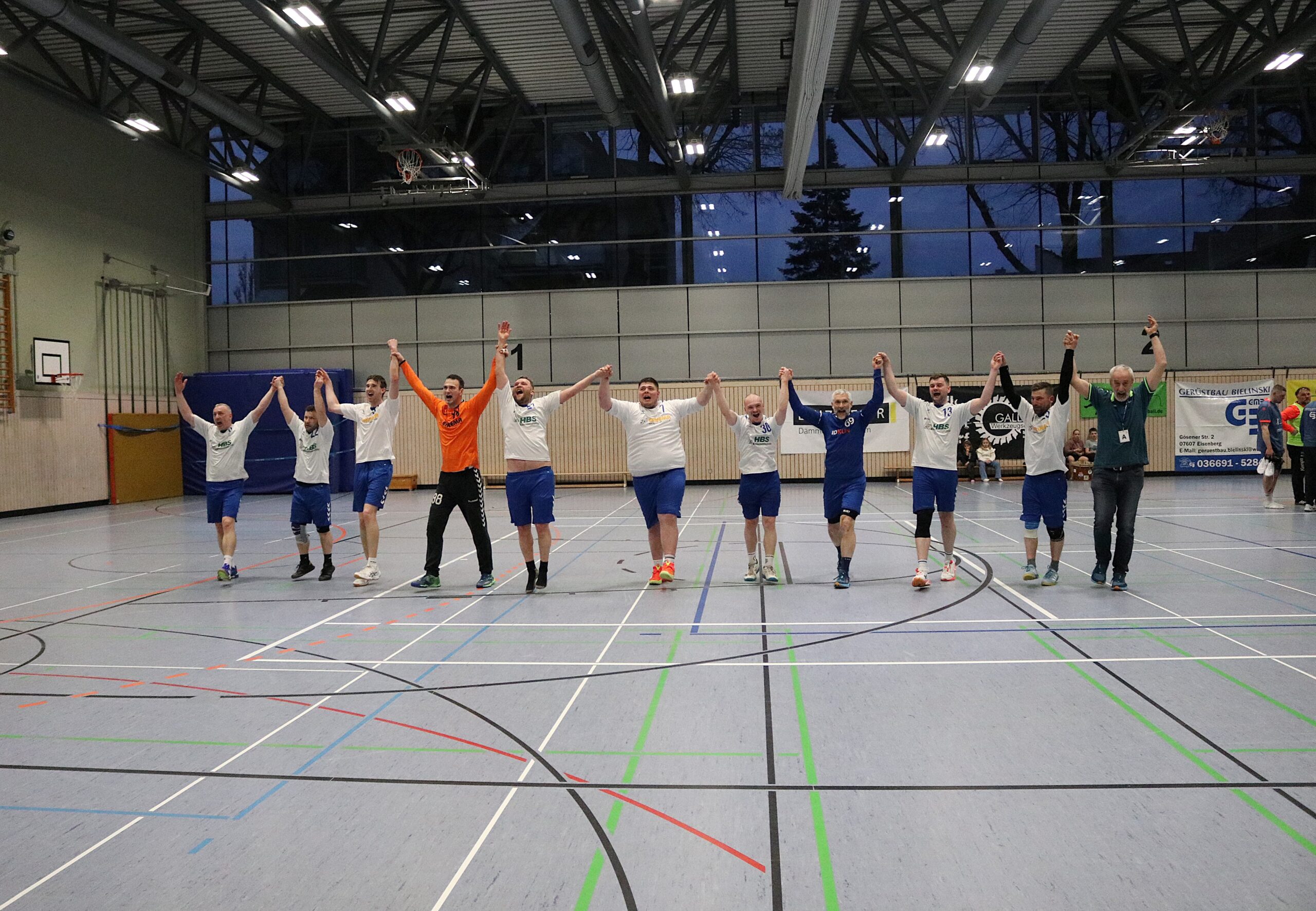 Kurz darauf folgte eine Schrecksekunde für die Aumaer, als Tim Seidel nach einer Tätlichkeit eines Gegenspielers zu Boden ging. Für die Blau-Weißen wurde die Partie nun auch zur Kraftfrage, zumal der Gastgeber gut drei Minuten vor Schluss auf 24:25 verkürzte. Und es sollte noch spannender werden: Nach einem Abspielfehler in den Blau-Weiß-Reihen gab es Strafwurf für die Gastgeber – doch erneut war der Aumaer Keeper zur Stelle. Als dann Henning Staps und Oscar Weise zum 24:27 trafen, brachen im Aumaer Fanblock Jubelszenen aus. Doch Eisenberg gab sich nicht geschlagen, stellte auf Manndeckung um und erzielte zwanzig Sekunden vor Schluss den 26:27-Anschlusstreffer. Die Spannung erreichte ihren Höhepunkt. Eine Unkonzentriertheit der Aumaer führte beinahe noch zum Ballverlust, jedoch erneut begleitet von einer Tätlichkeit eines Eisenbergers, sodass Auma in Ballbesitz blieb und schließlich den Sieg feiern konnte.