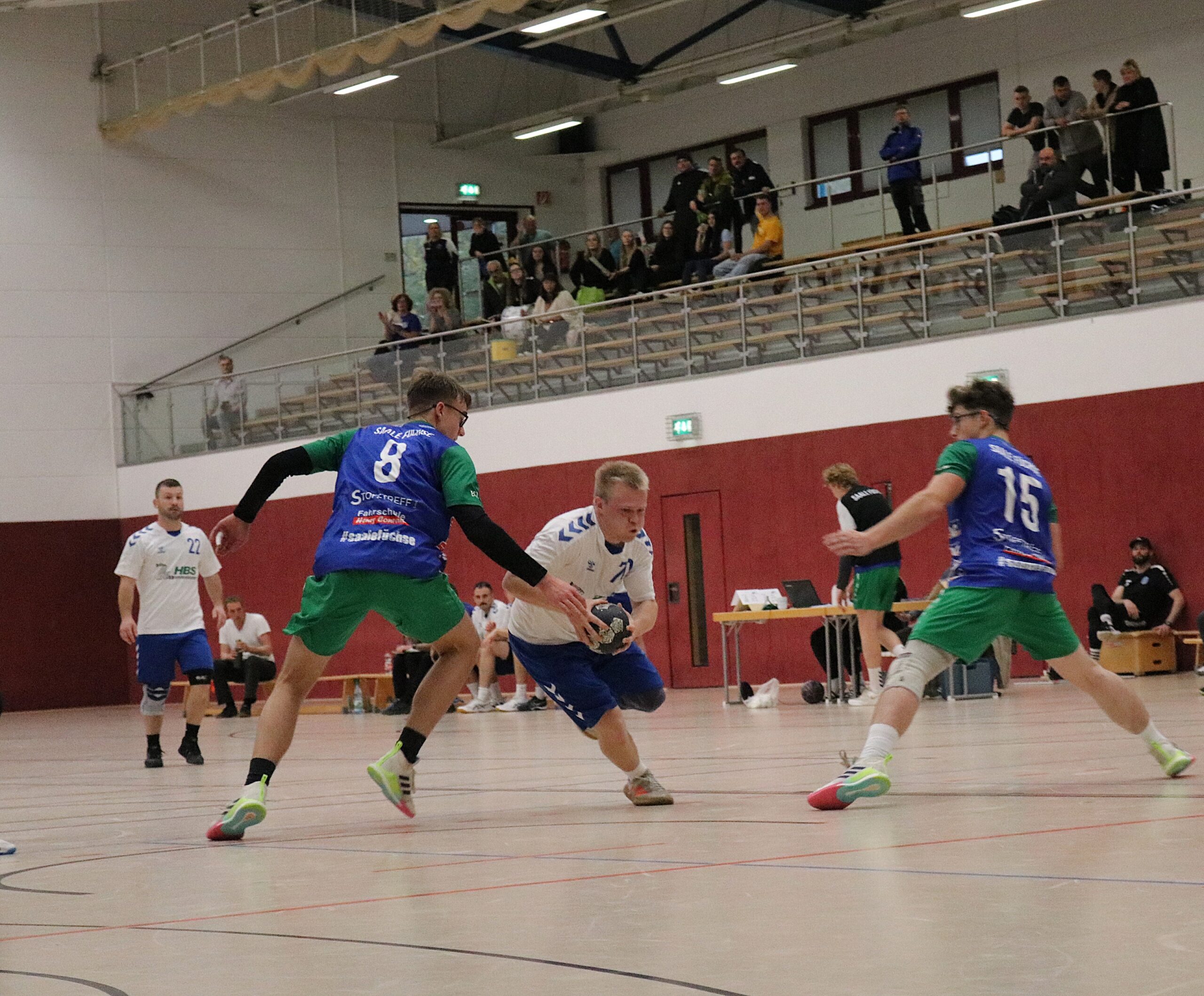Trotz einiger kleinlicher Entscheidungen der Schiedsrichter behaupteten die Gäste Mitte der ersten Hälfte eine 5:7-Führung. Die Hausherren suchten immer wieder den Kontakt und holten sich dadurch zahlreiche Zeitstrafen – insgesamt standen am Ende 14:4 Strafminuten zugunsten Bad Blankenburgs auf der Anzeigetafel. Dennoch ließ sich Auma nicht aus dem Konzept bringen. Nach dem 9:9-Ausgleich setzte Auma wichtige Akzente und ging durch Treffer von Oscar Weise erneut mit zwei Toren in Führung. In der Schlussphase der ersten Hälfte glänzte erneut Philipp Kopp, der in vier Minuten vier Würfe entschärfte. Mit dem 10:12 ging es in die Halbzeitpause.