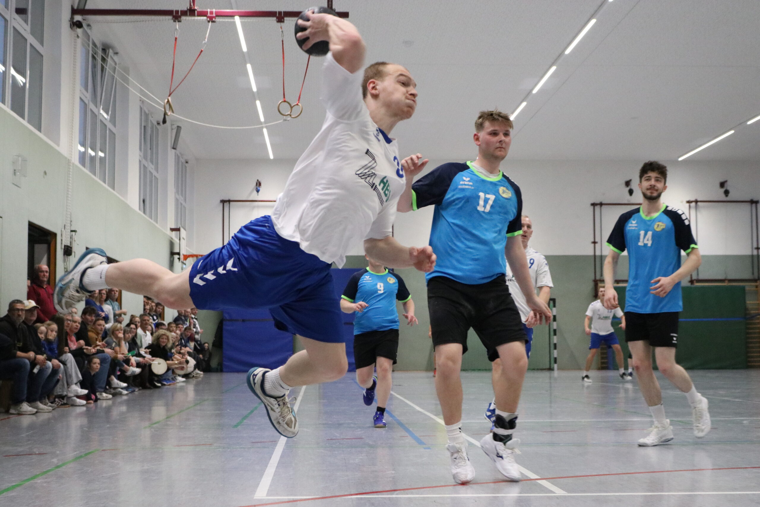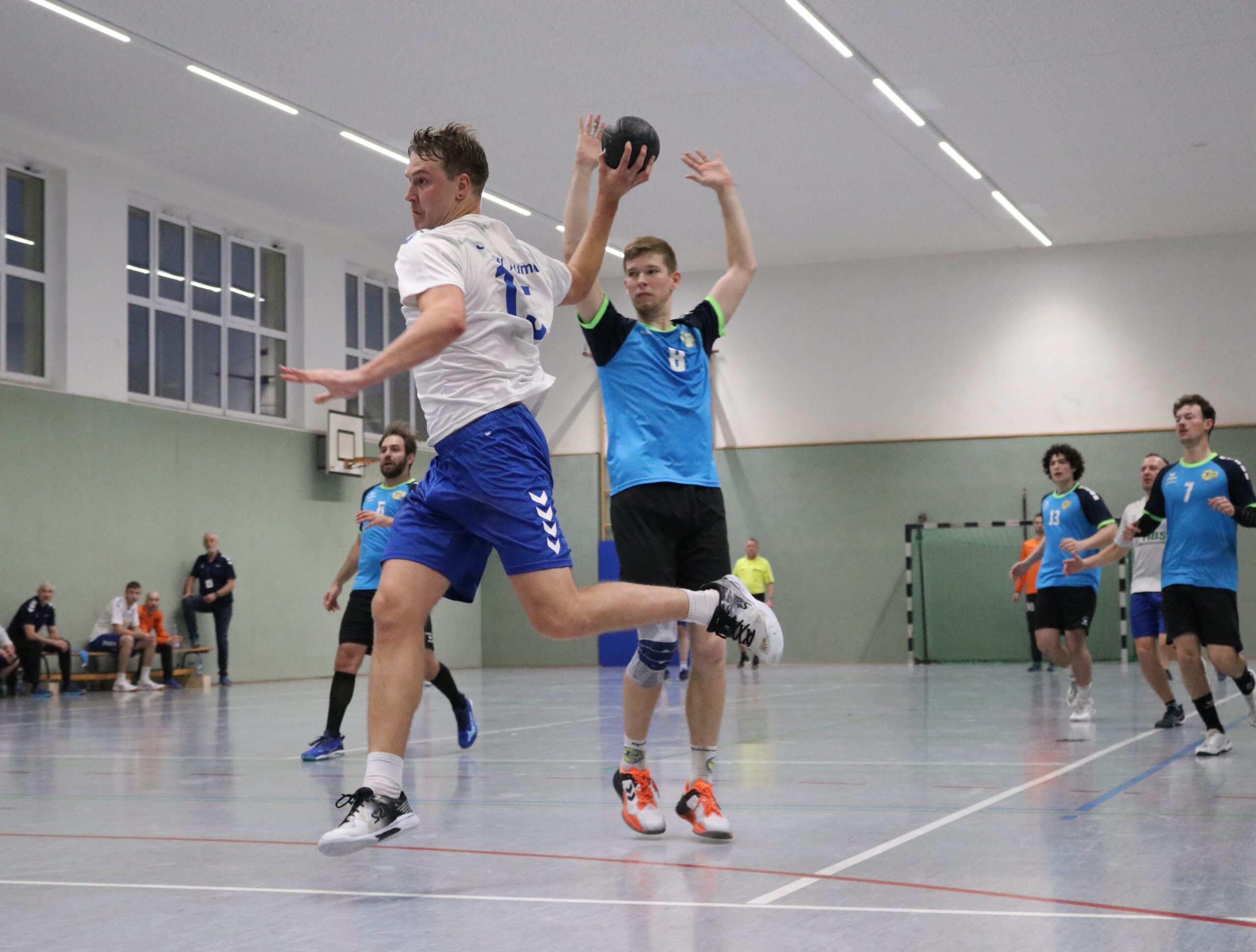 Der Start verlief jedoch alles andere als optimal: Gleich vier Würfe prallten ans Aluminium, weitere gute Chancen blieben ungenutzt – so stand es nach sechs Minuten 0:3. Erst Tim Seidel erlöste Team und Fans nach knapp acht Minuten mit einem satten Schlagwurf zum ersten Treffer. Dies war der Startschuss für die Aumaer Torjagd. In einer Überzahlsituation nutzten die Gastgeber ihre Möglichkeiten konsequent und glichen über die Außenpositionen zum 4:4 aus. Es entwickelte sich eine umkämpfte und ausgeglichene Partie, in der die Gäste nach der ersten Aumaer Führung beim 5:4 erneut in Front gingen. Trotz zahlreicher Möglichkeiten blieben die Blau-Weißen im Abschluss glücklos und mussten mit einem 11:13-Rückstand in die Pause gehen.