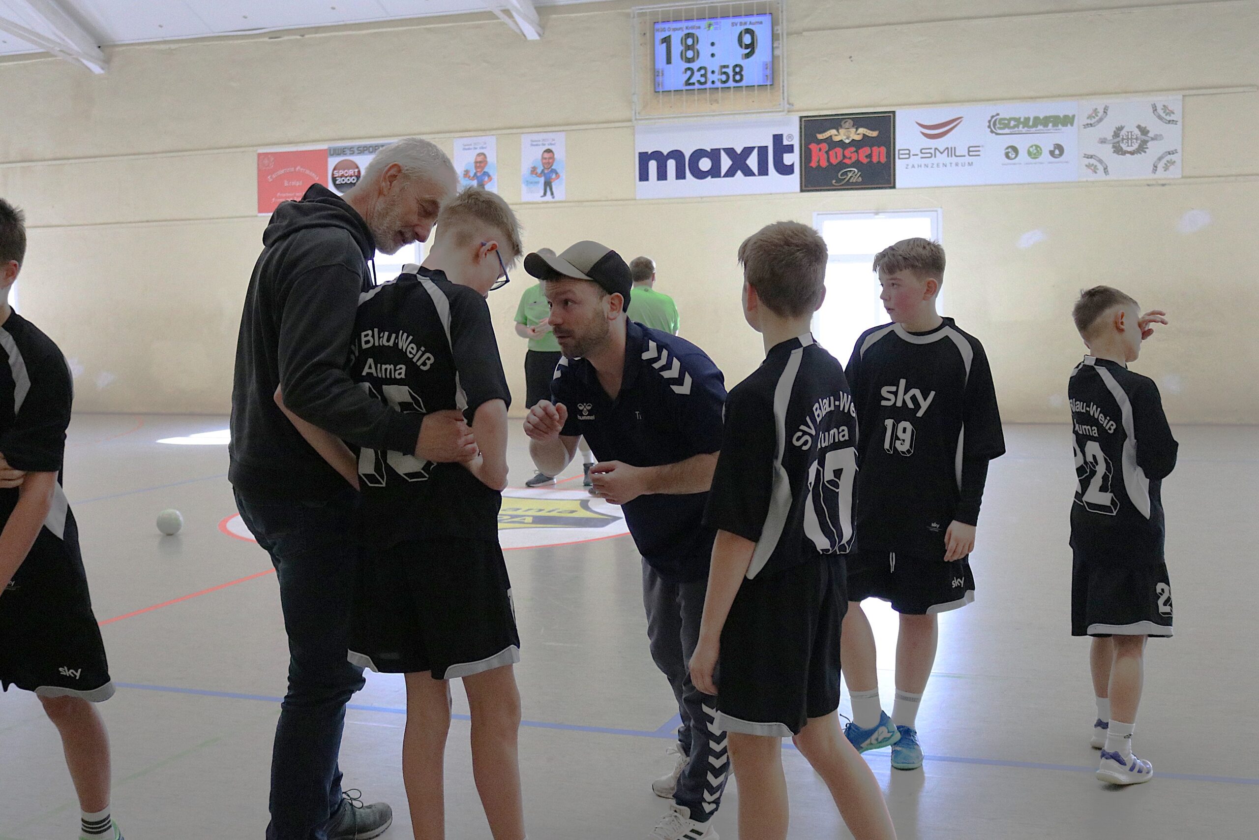 In der ersten Halbzeit fanden die Aumaer zunächst schwer ins Spiel. Die Gastgeber starteten mit viel Tempo, während Blau-Weiß erst in den Rhythmus kommen musste. Besonders Torhüter Julius Kipnich hielt seine Mannschaft mit mehreren starken Paraden im Spiel und verhinderte einen noch größeren Rückstand. Mit zunehmender Spielzeit kam Auma besser in die Partie. Durch schöne Passkombinationen im Angriff erspielten sich die Gäste gute Möglichkeiten. Auch aus dem Rückraum sorgten Emil Saberau und Bela Jahn in der ersten Hälfte immer wieder für gefährliche Würfe und daraus resultierende Treffer. Kurt Seidel überzeugte mehrfach mit starken Eins-gegen-Eins-Aktionen und setzte wichtige Akzente im Angriffsspiel. Dennoch führten gegen Ende der ersten Halbzeit einige Ballverluste durch zu schnelles Spiel dazu, dass sich die Gastgeber weiter absetzen konnten. So ging es mit einem 18:9-Rückstand in die Pause.